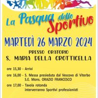 Martedì 26 marzo si svolgerà la PASQUA DELLO SPORTIVO, presso l’Oratorio Santa Maria della Grotticella a Viterbo. L’evento è organizzato dall’Ufficio Diocesano di Pastorale dello sport e tempo libero. Di seguito il programma: ore 15,30 – Arrivi ore 16,00 – S. Messa presieduta dal Vescovo di Viterbo S.E. Mons. Orazio Francesco Piazza ore 17,00 –…