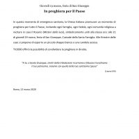 Giovedì 19 marzo, festa di San Giuseppe In preghiera per il Paese In questo momento di emergenza sanitaria, la Chiesa italiana promuove un momento di preghiera per tutto il Paese, invitando ogni famiglia, ogni fedele, ogni comunità religiosa a recitare in casa il Rosario (Misteri della luce), simbolicamente uniti alla stessa ora: alle 21 di…