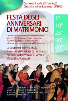 Domenica 2 aprile alle ore 16.00 presso la Cattedrale S. Lorenzo di Viterbo, il Vescovo S.E. Mons. Lino Fumagalli incontrerà gli sposi che festeggiano gli anniversari di matrimonio: il 1° – 10° – 25° – 50° – 60°. L’evento, promosso dal servizio di Pastorale Familiare della Diocesi, vuole essere un momento di testimonianza e di fede per dire grazie al Signore per il sacramento del matrimonio. Essere Famiglia è bello, fare Famiglia è bello: questo vogliamo gridare al mondo pensando soprattutto alle famiglie in difficoltà. Se non è bene che l’uomo sia solo, altrettanto non è bene che la Famiglia sia sola. La famiglia deve tornare al centro della cultura, della politica, dell’economia, della finanza, della vita dei popoli e delle nazioni. Abbiamo bisogno di riscoprire la bellezza dell’amore, non quello fatto di parole mielose e di circostanza ma quello a immagine di Dio. Un amore carico di condivisione, rispetto, gratitudine. E allora ciascuno dovrebbe ripetere nel suo cuore “LO PROMETTO”: prometto a te Signore di esserti fedele sempre. “LO PROMETTO”: farò di tutto per amarti e per riconoscere tutto ciò che Tu Gesù fai per me. E allora anche tutti gli anni di matrimonio saranno magnifici, quelli di tutta la vita, perché saranno vissuti alla luce dell’amore di Dio.